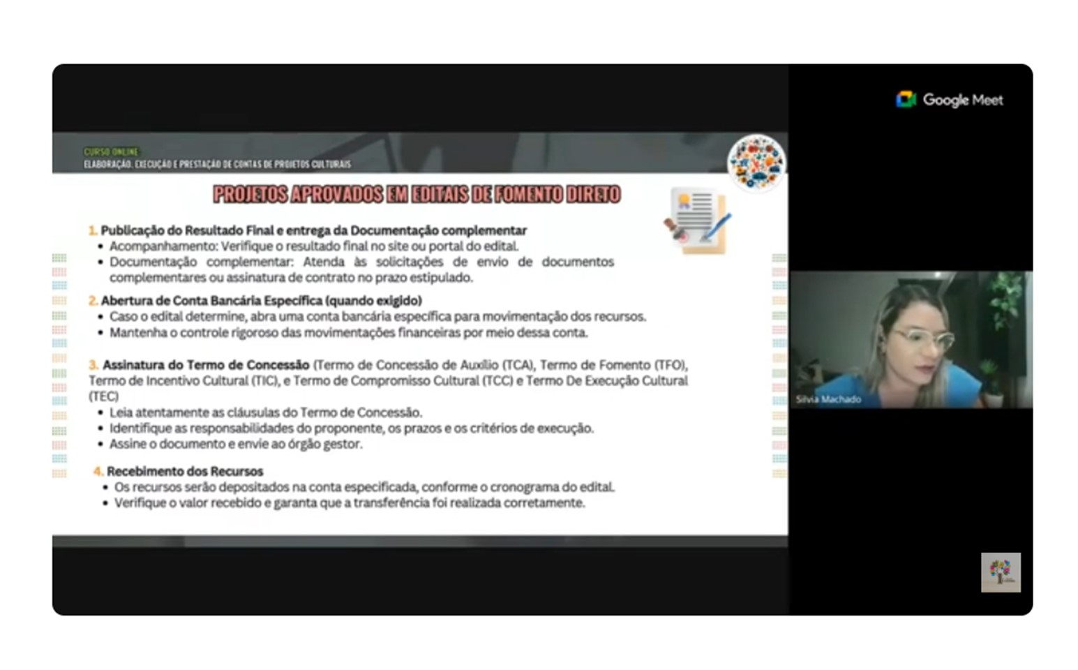 Os slides detalharam os passos específicos para projetos aprovados tanto em leis de incentivo com renúncia fiscal (fomento indireto) quanto em editais de fomento direto. Entre os pontos abordados estiveram a abertura de contas bancárias específicas, a captação e movimentação correta dos recursos, a assinatura de termos de concessão e o acompanhamento rigoroso dos depósitos e pagamentos.