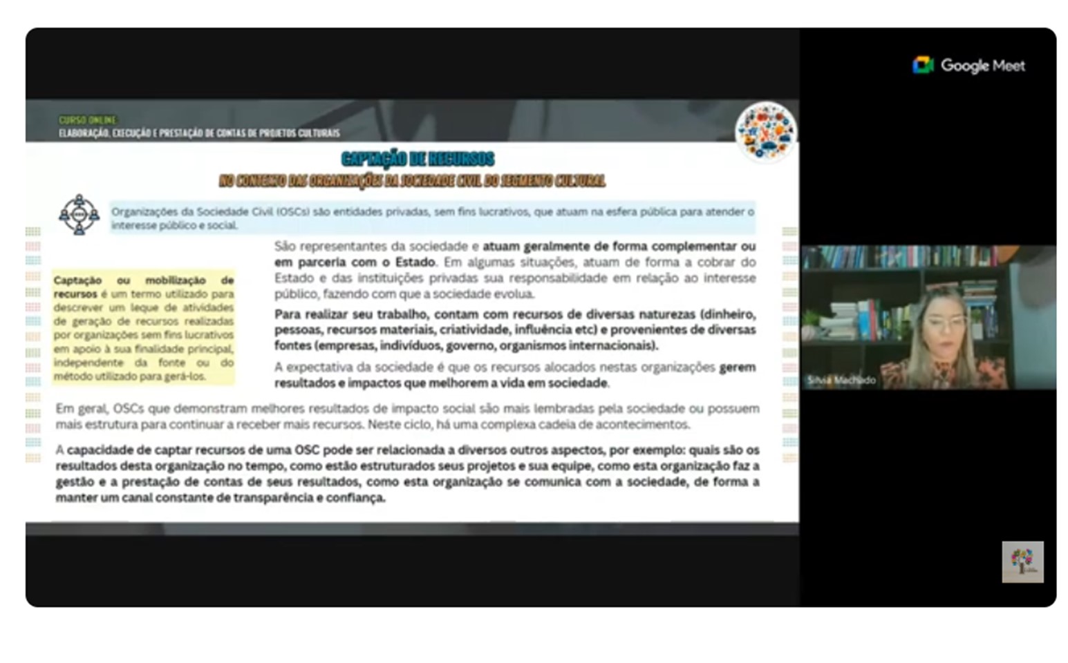A primeira aula abordou as principais mecanismos de captação de recursos para organizações culturais, com foco na sustentabilidade institucional e no fortalecimento das ações culturais no país.