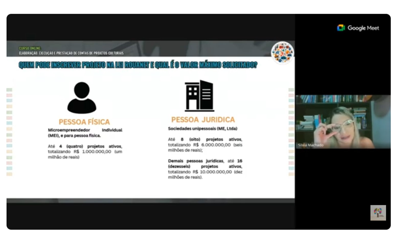 A aula, que faz parte de uma série de 10 módulos do curso, foi ministrada com foco na explicação detalhada das leis de incentivo que possibilitam a captação de recursos via dedução fiscal — um dos principais instrumentos de fomento cultural no país.