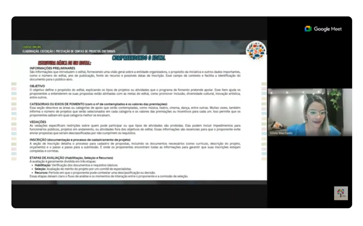 Durante a aula, instrutores destacaram que os editais públicos de cultura representam uma das principais formas de obtenção de recursos para projetos culturais no Brasil — distintos das leis de incentivo fiscal, pois os editais fornecem apoio direto por meio de seleção técnica e repasse financeiro sem intermediários fiscais. Os participantes tiveram acesso a explicações detalhadas sobre como identificar, analisar e se inscrever em editais compatíveis com seus projetos.